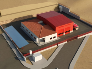 - Edificio administrativo (5,40 m de altura) que albergará despacho, vestuarios masculinos y femeninos, áreas de aseo, lavandería y taquillas de intervención.